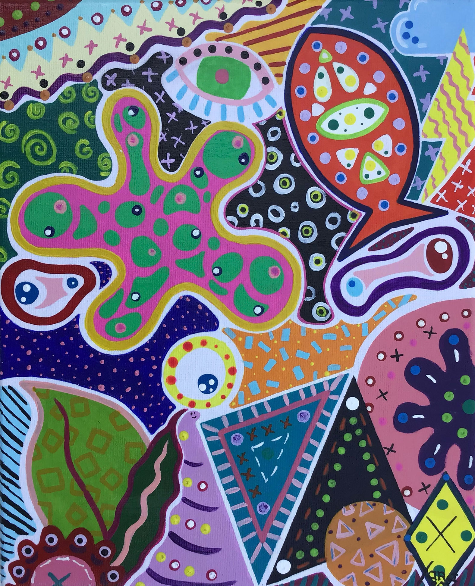 Pink Gangsther Acrylverf, verfstift, pouringmedium en 3D liner op canvas. Stempeltechniek met halve citroen, mandarijnennetje en bubbeltjesplastic. Druiptechtiek met een spuitje. 40×60 cm Oktober 2021