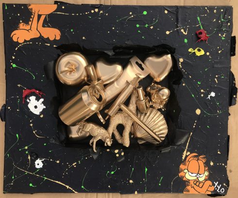 Oud papier op canvas met houdlijm, acrylverf en goud gespoten afval met spuitverf