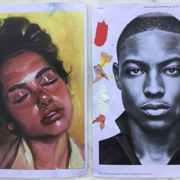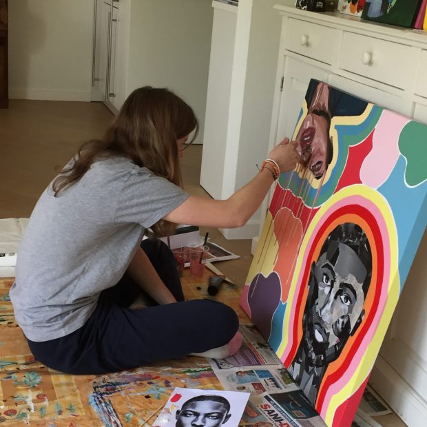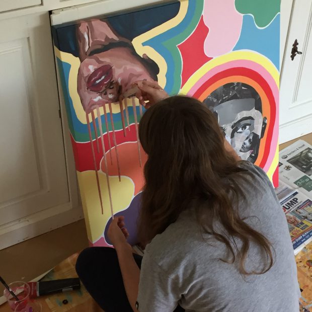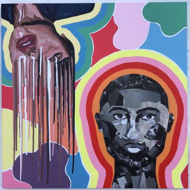 Two Faced Collage kunst van kranten, tijdschriften, papier-maché en acrylverf op canvas. 80×80 cm Druiptechniek met spuitje en pouring medium. Project navigationVorigePrevious project:Colour Fantasy 2VolgendeNext project:Pink Gangsther